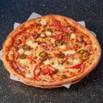 Tomatsaus, ost, paprika, løk, mais, champignon, ananas, tomat og oliven